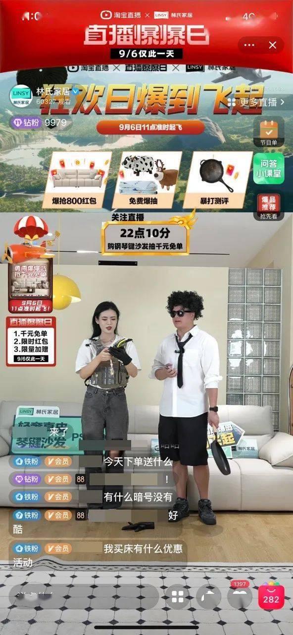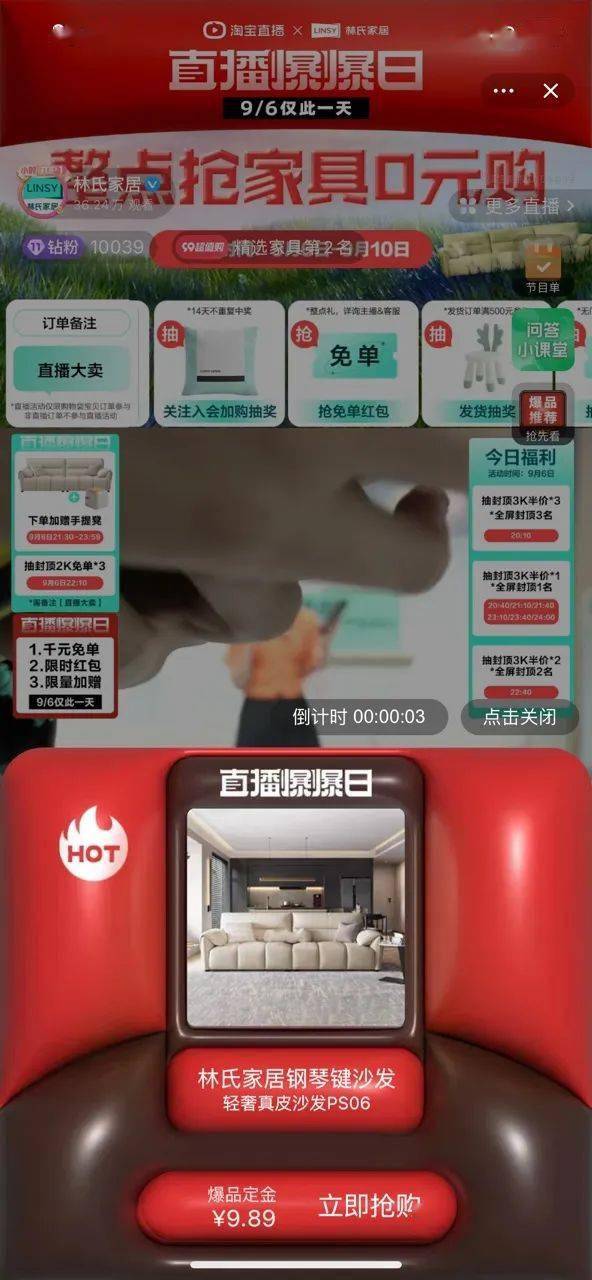 林氏家居在9月6日直播当天供给的优质价格和专属权益是单品打爆的重要的条件。主推爆品在价格上完成与618同价,招引客户下单。在直播间专属权益方面,林氏家居运用直播间贴片着重千元免单、限时红包、限时加赠等专属权益,直播间顶部翻滚满额送赠的福利品,影响用户往更高档位下单,拉升直播全体成交。