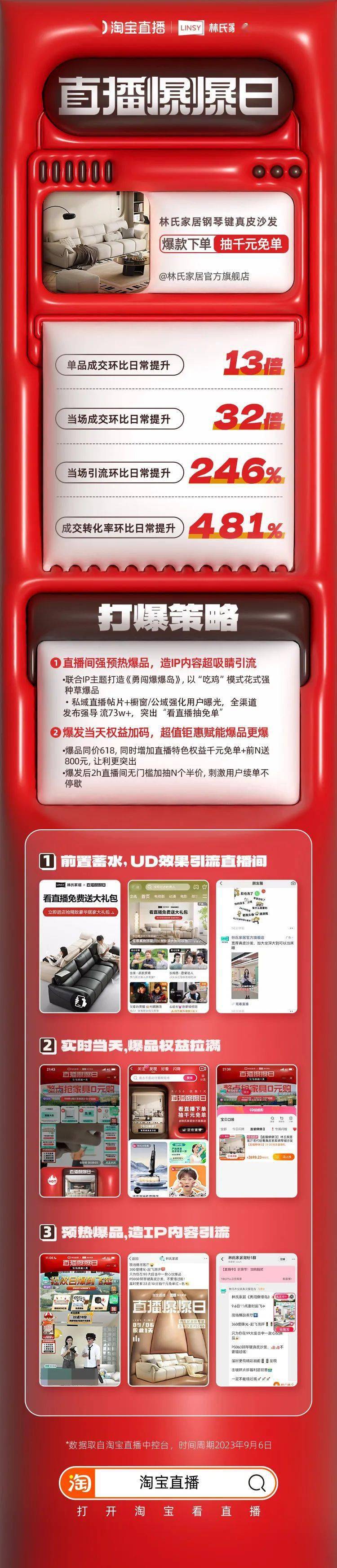 直播前的预热期,林氏家居经过私域直播贴片、橱窗/公域多点位展现,并协作UD作用投进,全途径发布直播信息,杰出“看直播抽免单”,提高品牌和直播信息的曝光度,强势蓄水引流,全体导流超73万。