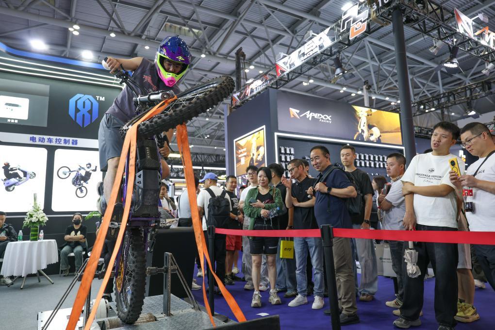 2025年9月,观众在重庆摩博会现场体会国产新能源摩托车操控器主动翘头功用。新华社记者 陈诚 摄
