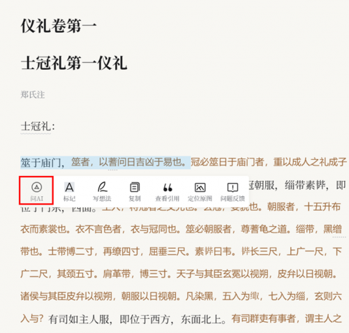 用户打开“识典古籍”官网即可免费体验这项新功能,当遇到读不懂的古文语句时,点击“问AI”,就能够正常的看到这句话的翻译,还可以用日常说话的方式,让智能助手总结文本内容,提出可供参考的研究问题,进行跨古籍提问等。如用户提问“我想找跟北京相关的古籍”,智能助手就会通过语义检索“识典古籍”的资料库,给出解答,直接在回答中显示引用的参考资料和原文链接。
