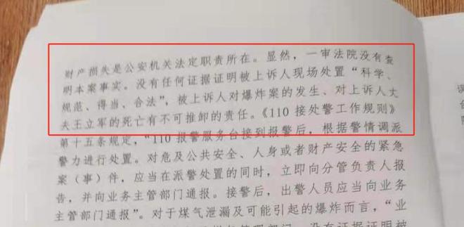 一审判决后,王艳丽提出上诉。二审期间,王艳丽认为法院没有查明本案事实,也没有一点证据证明被上诉人现场处置“科学、规范、得当、合法”,为此她向法院提交了《申请法院调查取证申请书》,申请法院调取“6·19爆炸案事故调查报告”。王艳丽回忆,警方在回答法官问话时承认存在多部门签发的事故调查报告,并承诺庭后一周之内提供,“他们不给,跟他们要就说没有。”时至今日,王艳丽仍未看到这份调查报告。