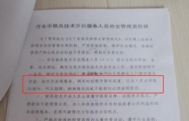 王艳丽说,和相识时,他就是一名锁匠,在丹东市经营一家小锁铺。2007年,通过严格的开锁技能考试,与丹东市公安局治安管理支队签署了一份《丹东市锁具技术开启服务人员治安管理责任状》(以下简称《责任状》),正式成为一名“持证”的市区锁具技术开启服务人员。